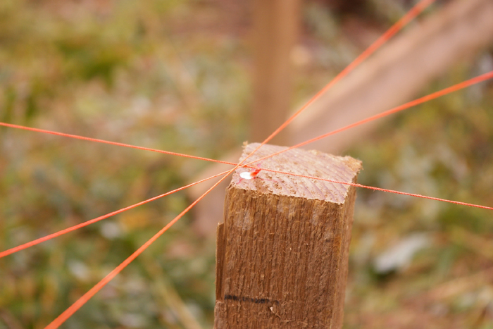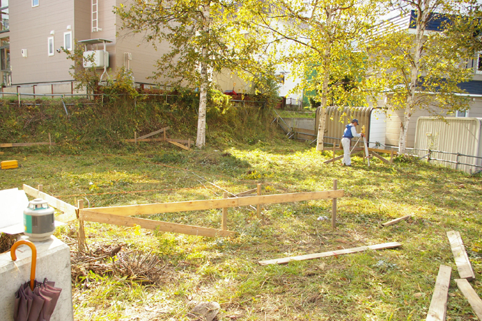 コンセプト住宅で、先に遣り方(建物の建築位置の寸法だし)を行いました。