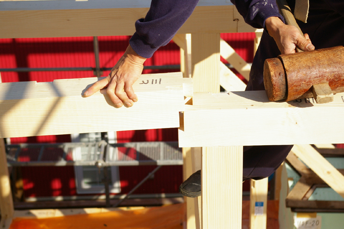 こちらもカットされた材料をはめて釘打ちにて接合。