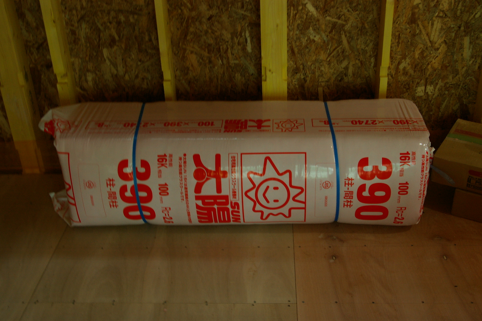 100㎜厚みのある断熱材です。これを壁軸間(柱間)に入れます。