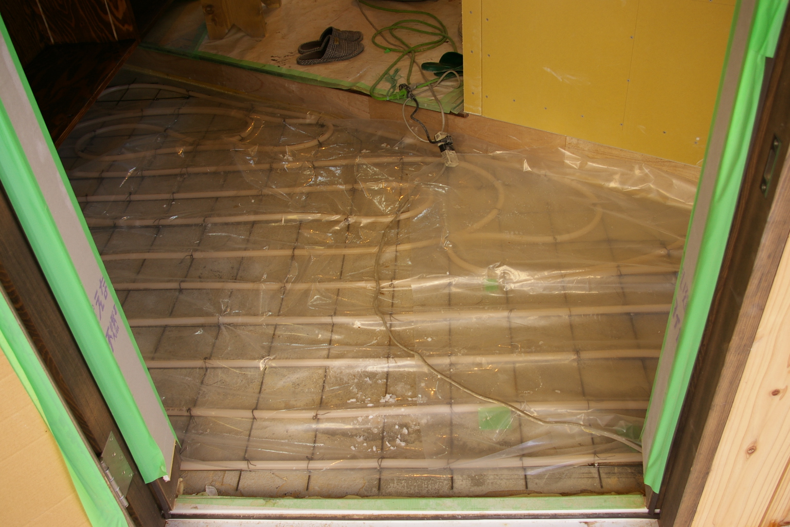 三角形の玄関土間は床暖房パイピングが施工されました。