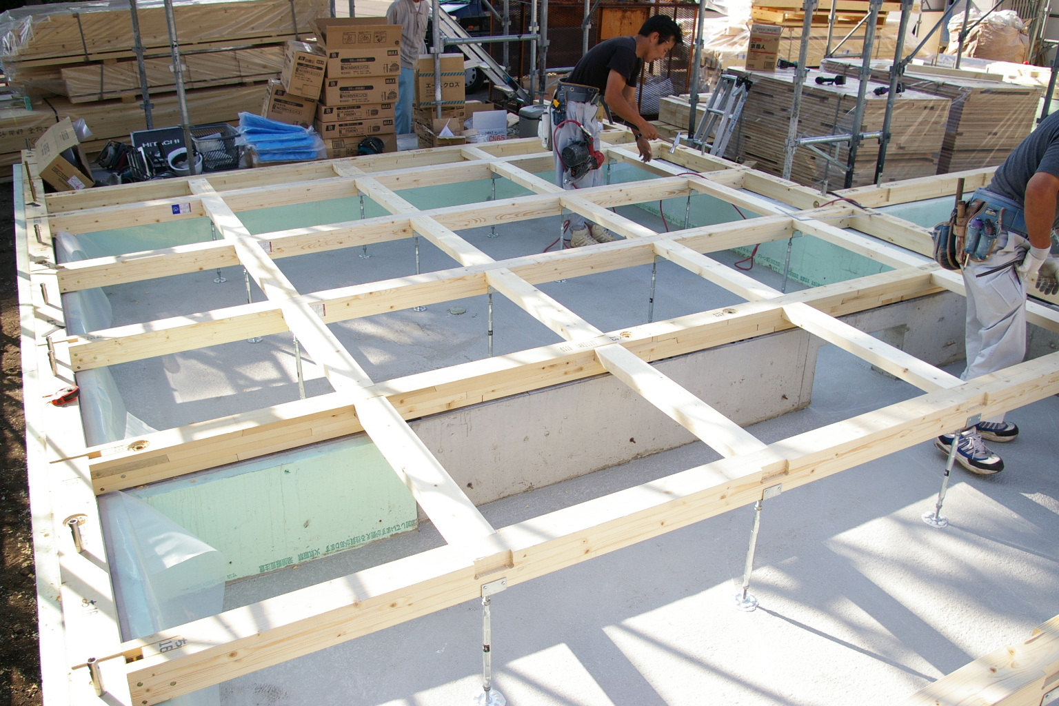 午前は土台敷きまで。午後からは大引入れ〜1階柱まで完成したのではと。