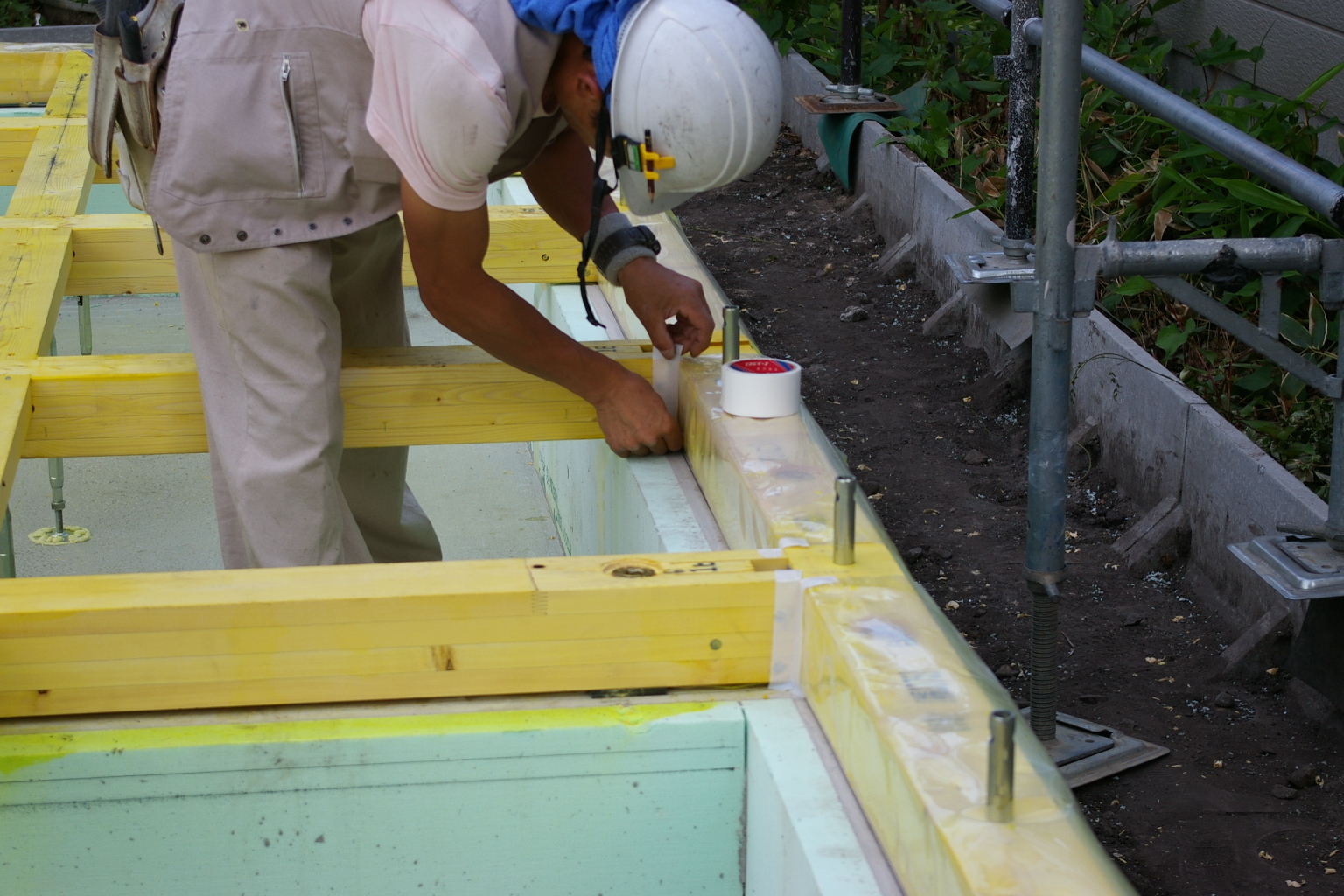 基礎〜土台の気密シート付きパッキン部分の立ち上げ〜欠損部分の気密テープ張りです。