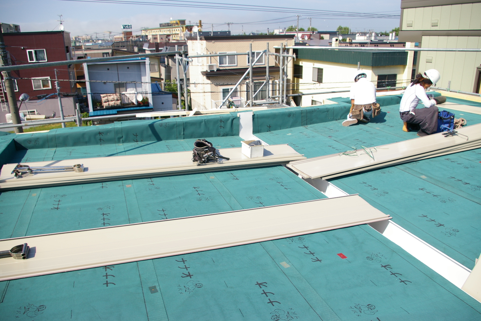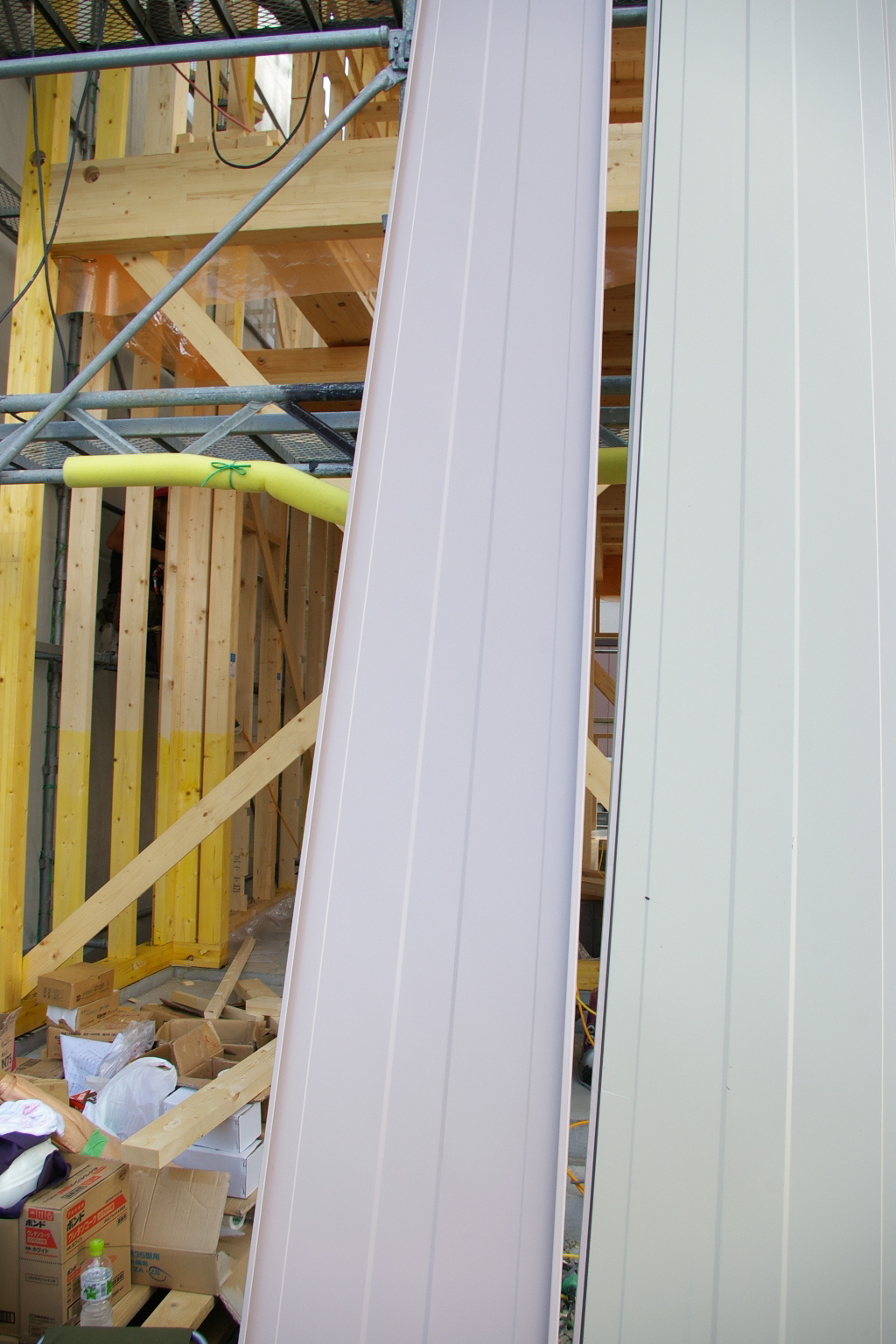 今日は屋根下地まで完成して屋根板金が運ばれました。