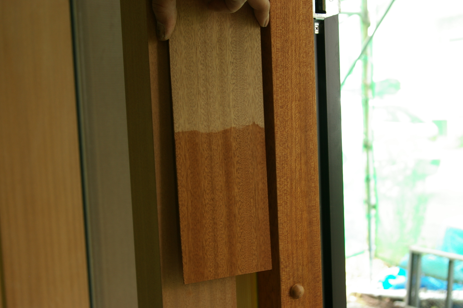 リビング窓,マホガニー材に合わせて枠を塗装します。