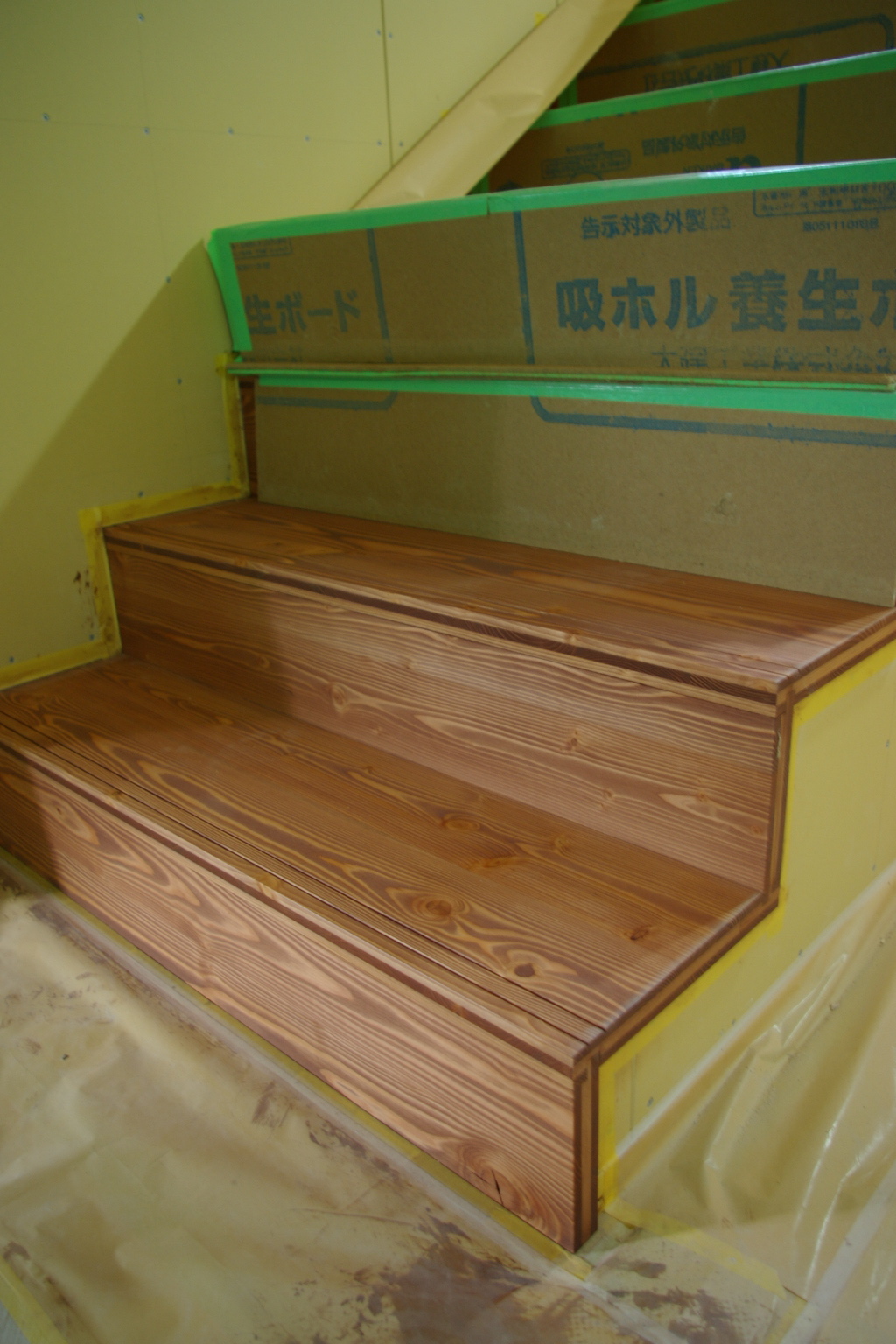 こちらは階段 カラマツ三層ボードをオスモカラー仕上げに。