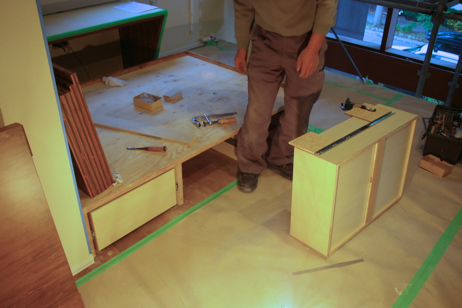 美園 造作2 2013.10.16 造作(建具など) | 03美園の家 美園 新築現場 造作什器工事です。 2階書斎コーナー 引き出し〜本棚、取り付けです。 段差を利用した収納 引き出し収納はこんな感じです カラマツの本棚。 仮止めですが。 開口面は建具が付く予定です。 、、、(照明器具も点灯しています) < 前の記事へ次の記事へ > 関連記事 2013.10.2603美園の家 美園 コバ硝子 2013.06.0803美園の家 美園現場 基礎根切り 2013.11.0503美園の家 美園見学会予約状況2 2013.09.0903美園の家 美園 造りもの 2 ブログトップ
