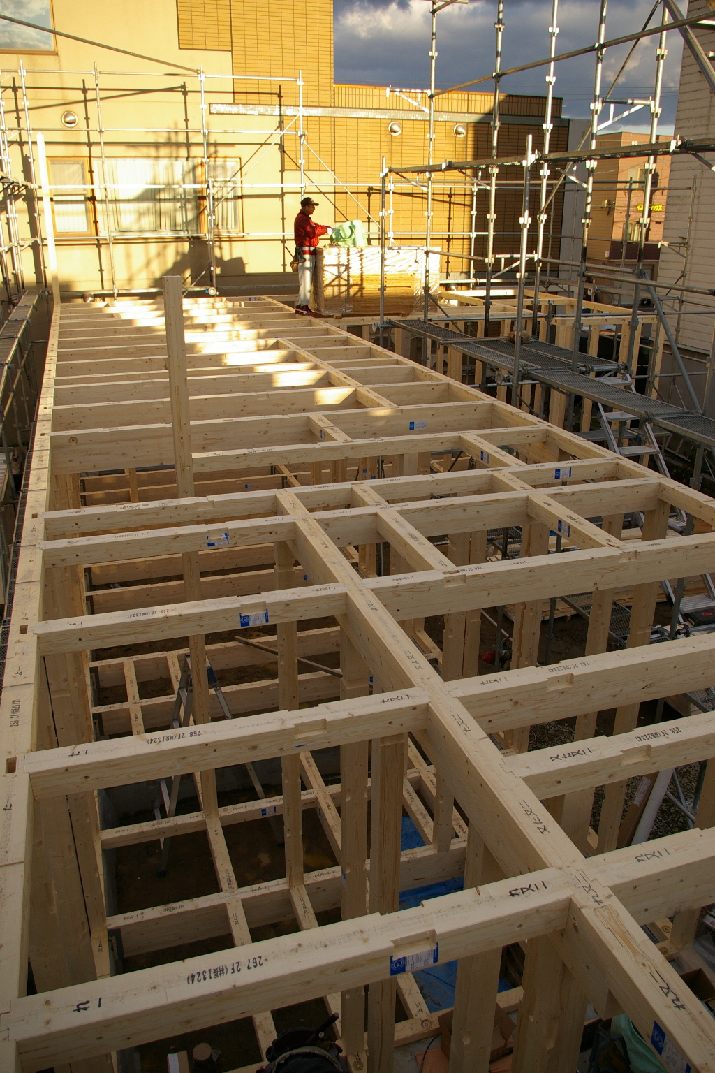 東区 建て方が始まりました。 2013.10.17 05東区の家 東区 新築現場 今日から建て方がはじまりました。 天候も何とか雨も降らず。 土台敷きから 土台敷き〜大引入れ〜柱を建てて 胴差しを入れていきます。 構造梁は ユニックで一気に、、、 梁を掛けていきます。 午前8時から午後3時まで 1階構造が大体できた所です。 何となく1階部分 L型の間取りが見えてきました。 1 < 前の記事へ次の記事へ > 関連記事 2013.11.0605東区の家 東区 屋根工事 2013.10.0505東区の家 東区 新築現場 2013.12.0305東区の家 足場が解体されました。 2013.11.2005東区の家 ようやく、、 ブログトップ