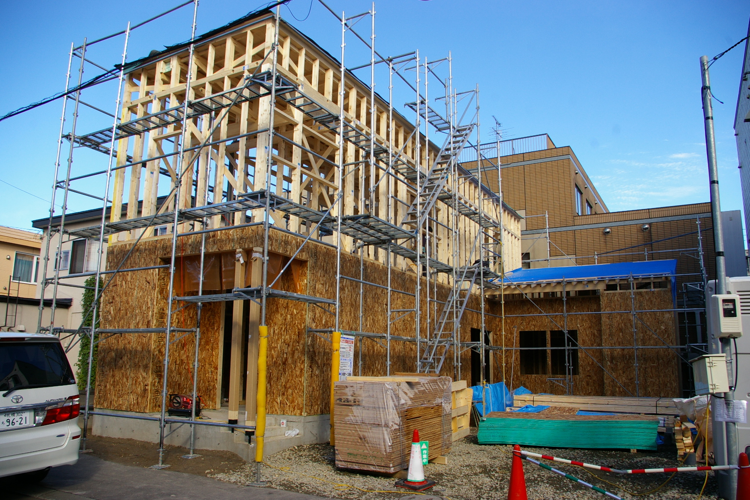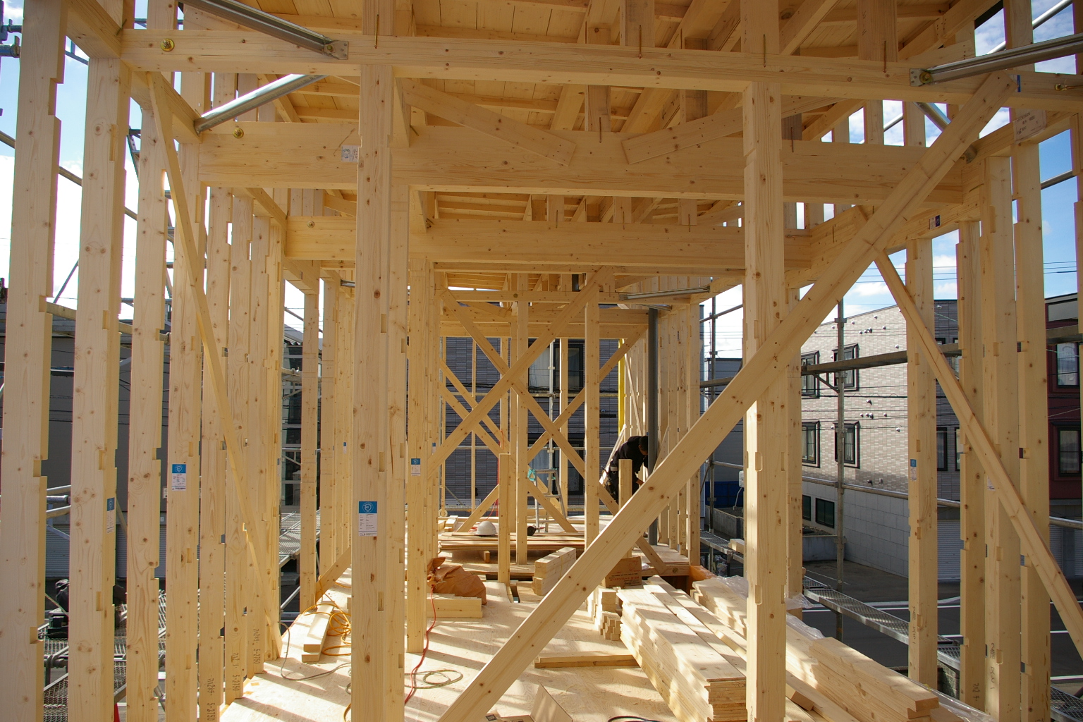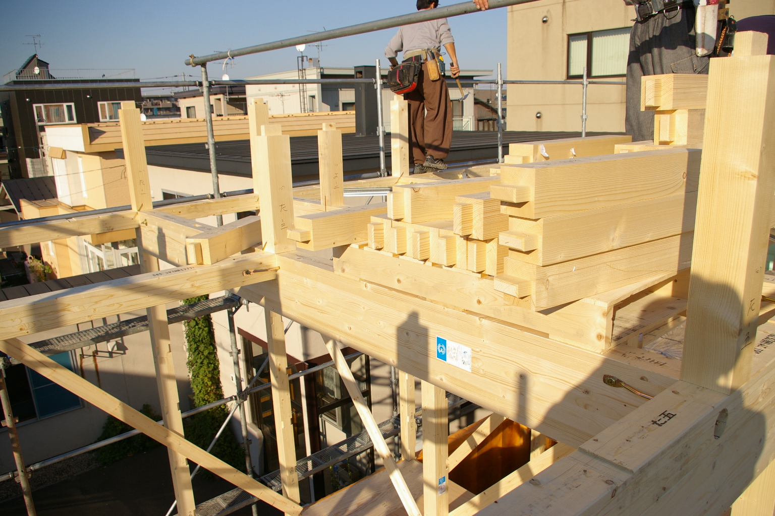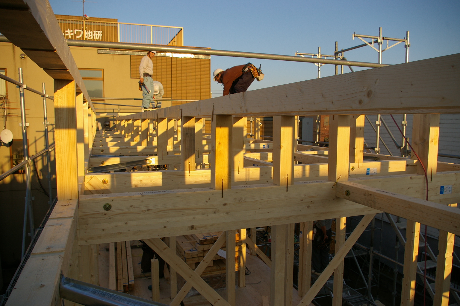 東区 建て方3 2013.10.21 05東区の家 東区 新築現場 2階小屋組み 屋根の束立て〜 大工さんはひょいひょいと梁の上を歩き渡ります!! 慣れているとは言え、、、ちよっと怖いです。 母屋も掛けて、、。 日曜日も休み無く出てもらい屋根完成!! 板金屋さんもダクト、ルーフまで終了。 今日も引き続き、、。 2階間柱入れ。 外観 2階OSBを貼れば少々の雨も大丈夫!! < 前の記事へ次の記事へ > 関連記事 2013.12.04Detail(細部・納まりなど) 東区新築現場 フロアを 2013.12.1705東区の家 間もなく完成!? 2013.11.0605東区の家 東区 屋根工事 2013.12.0705東区の家 東区 外観完成 ブログトップ