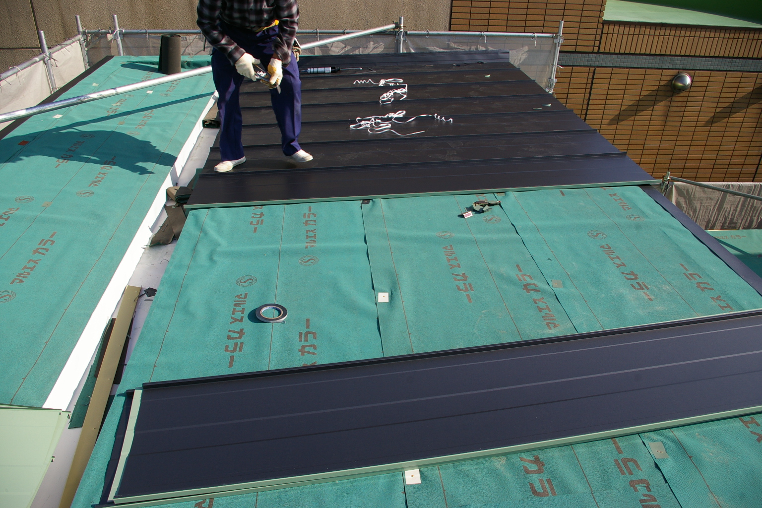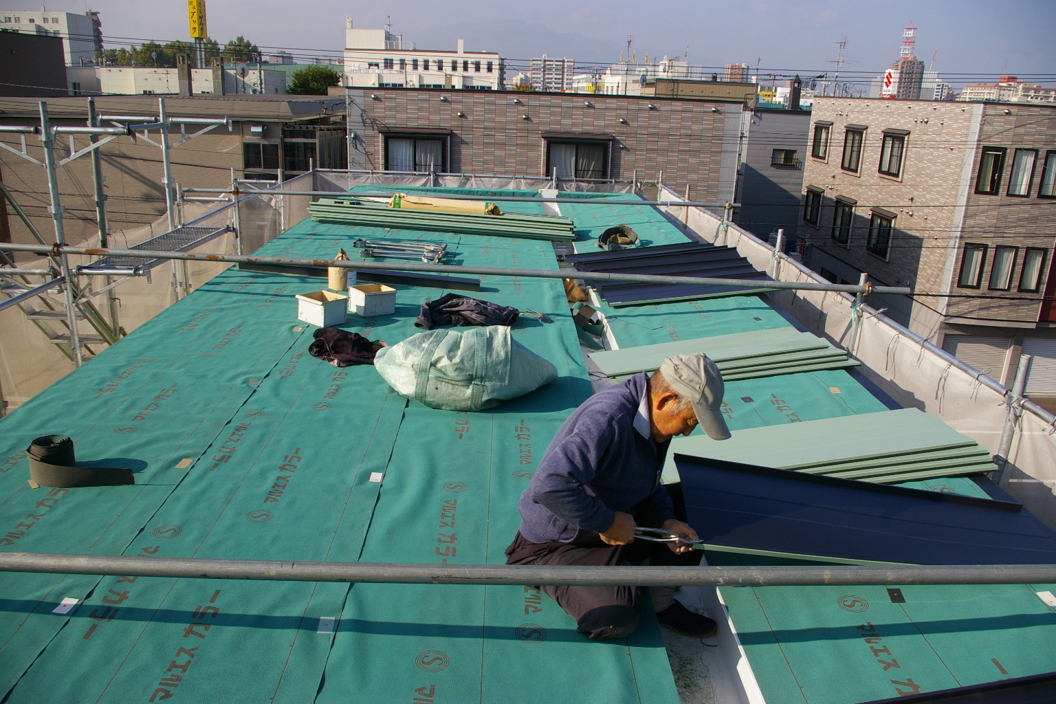 ベテラン職人さんが1枚づつ屋根施工しています。