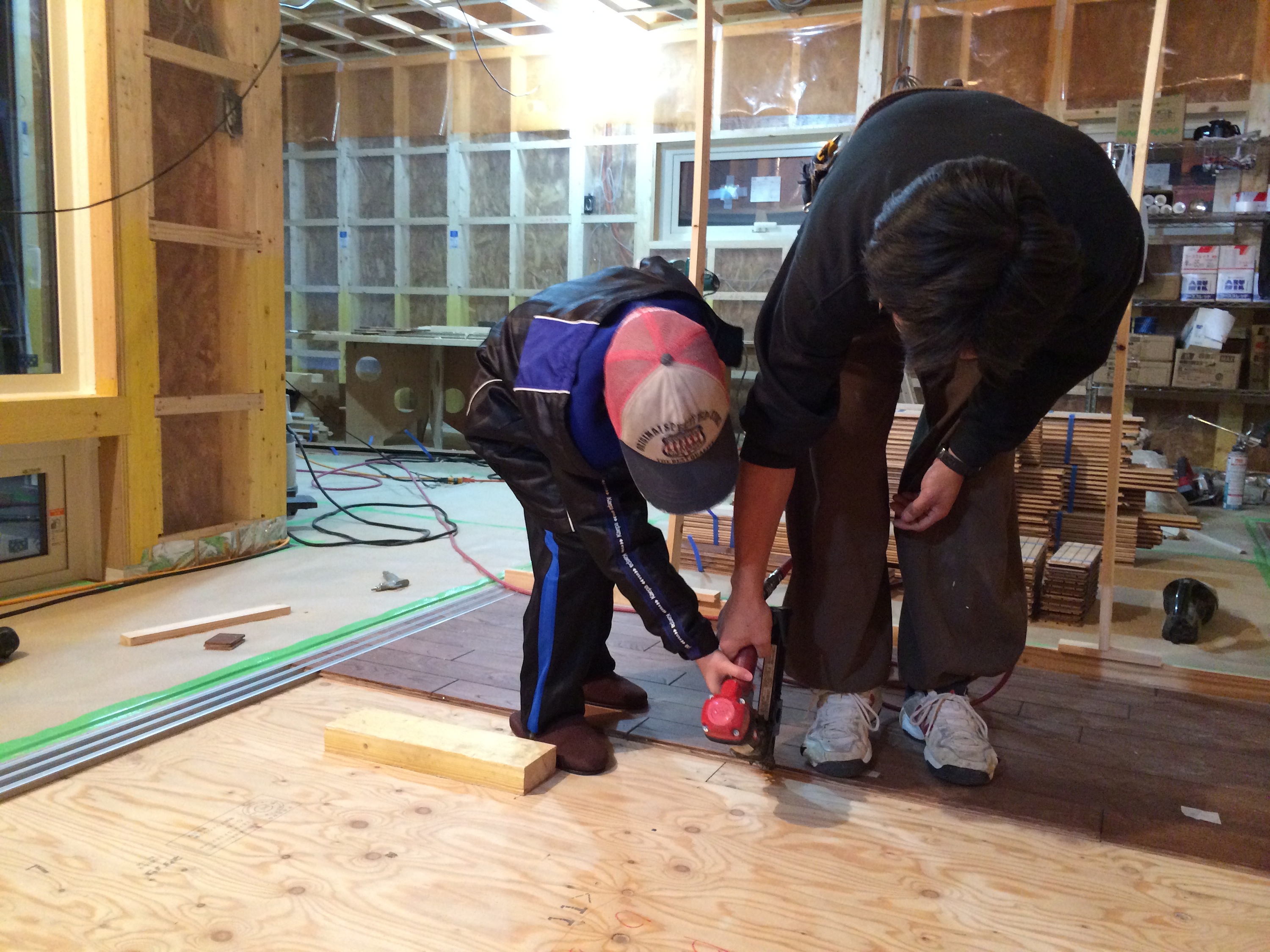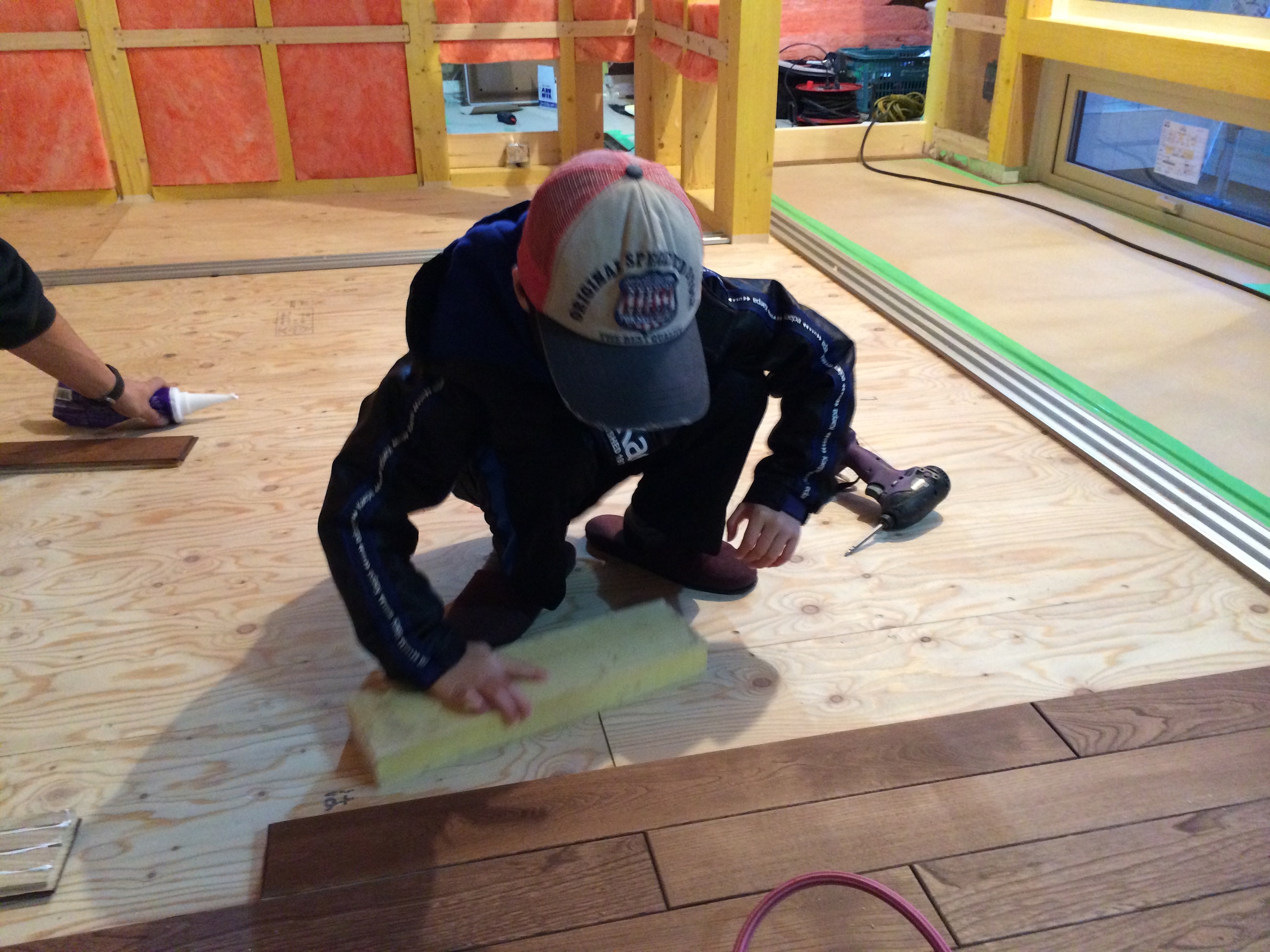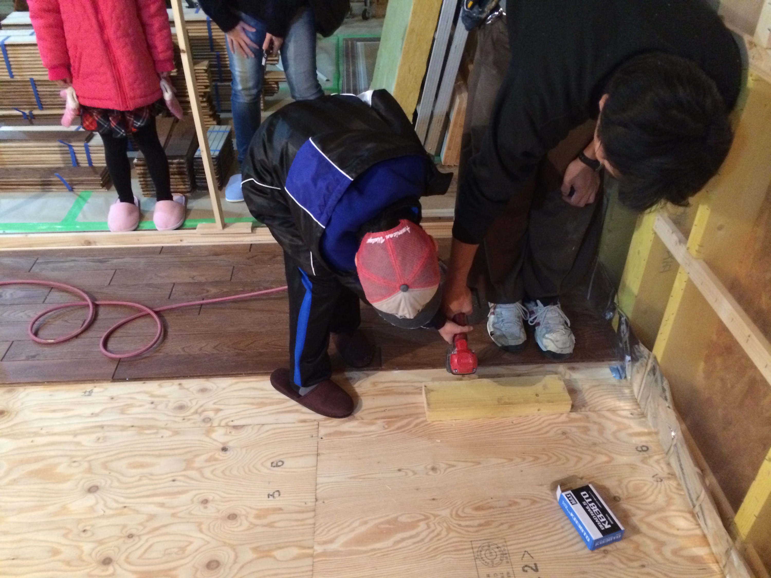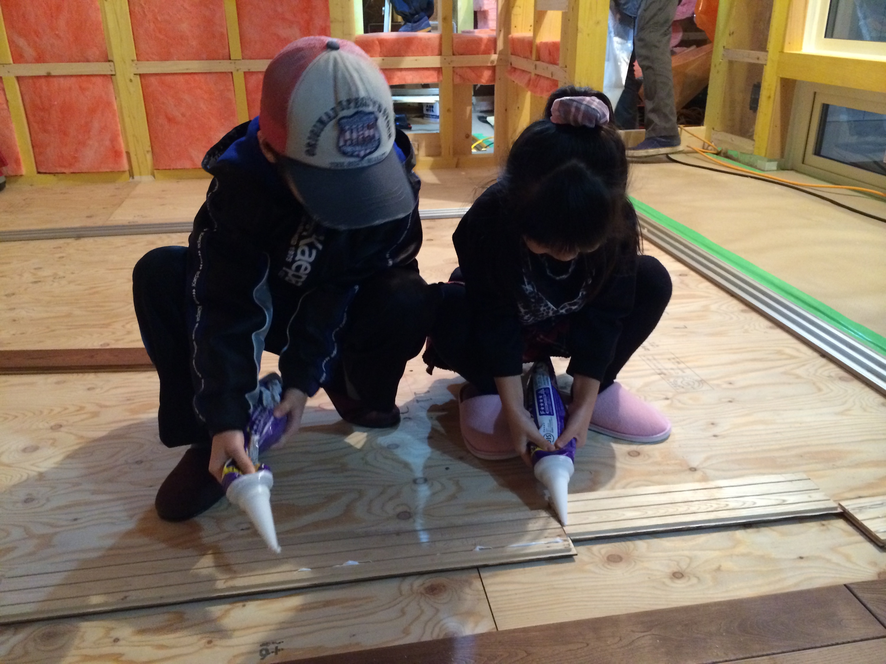 今日はお施主様のお子様達が現場へ来てフロア貼りのお手伝い。