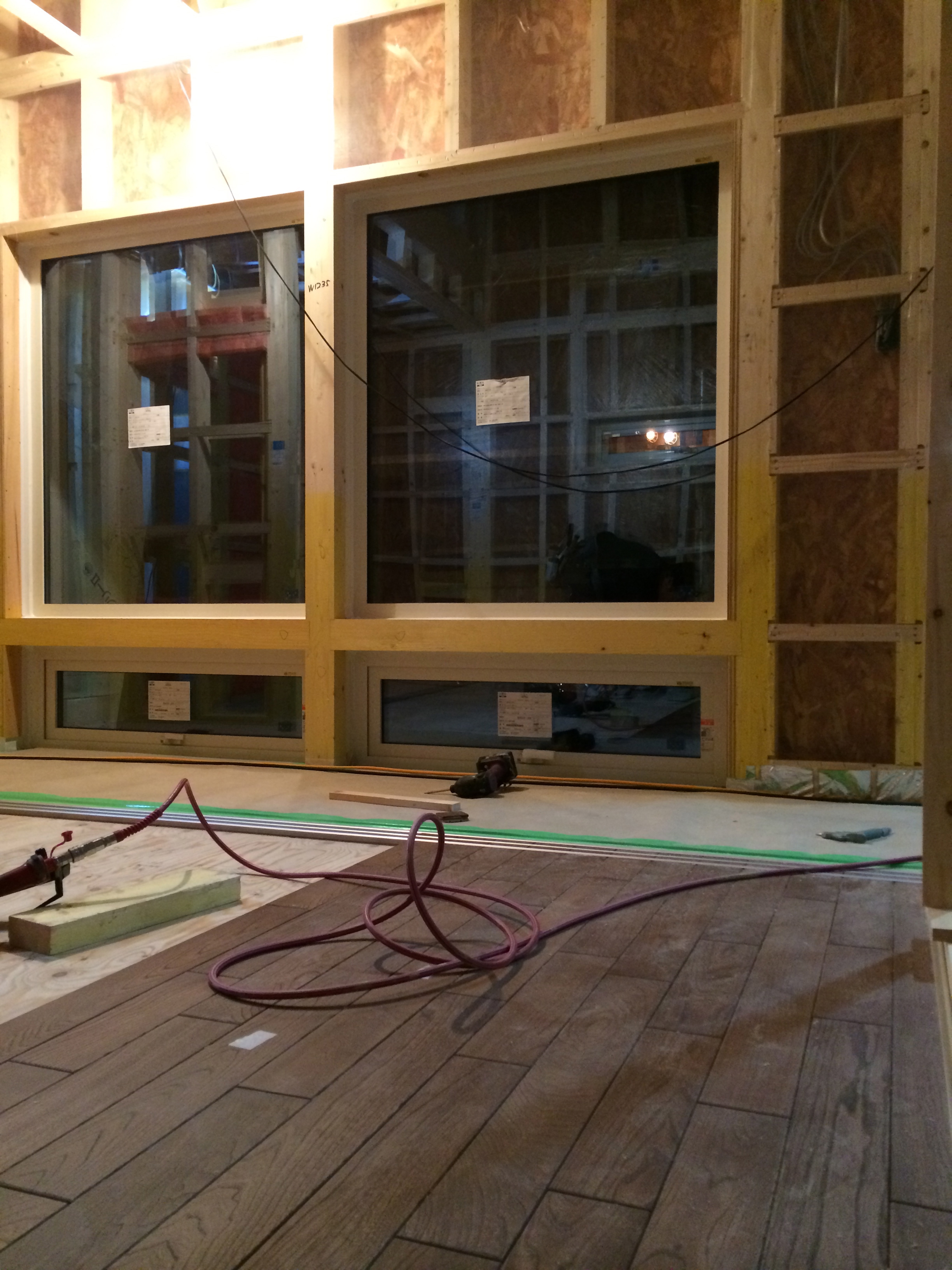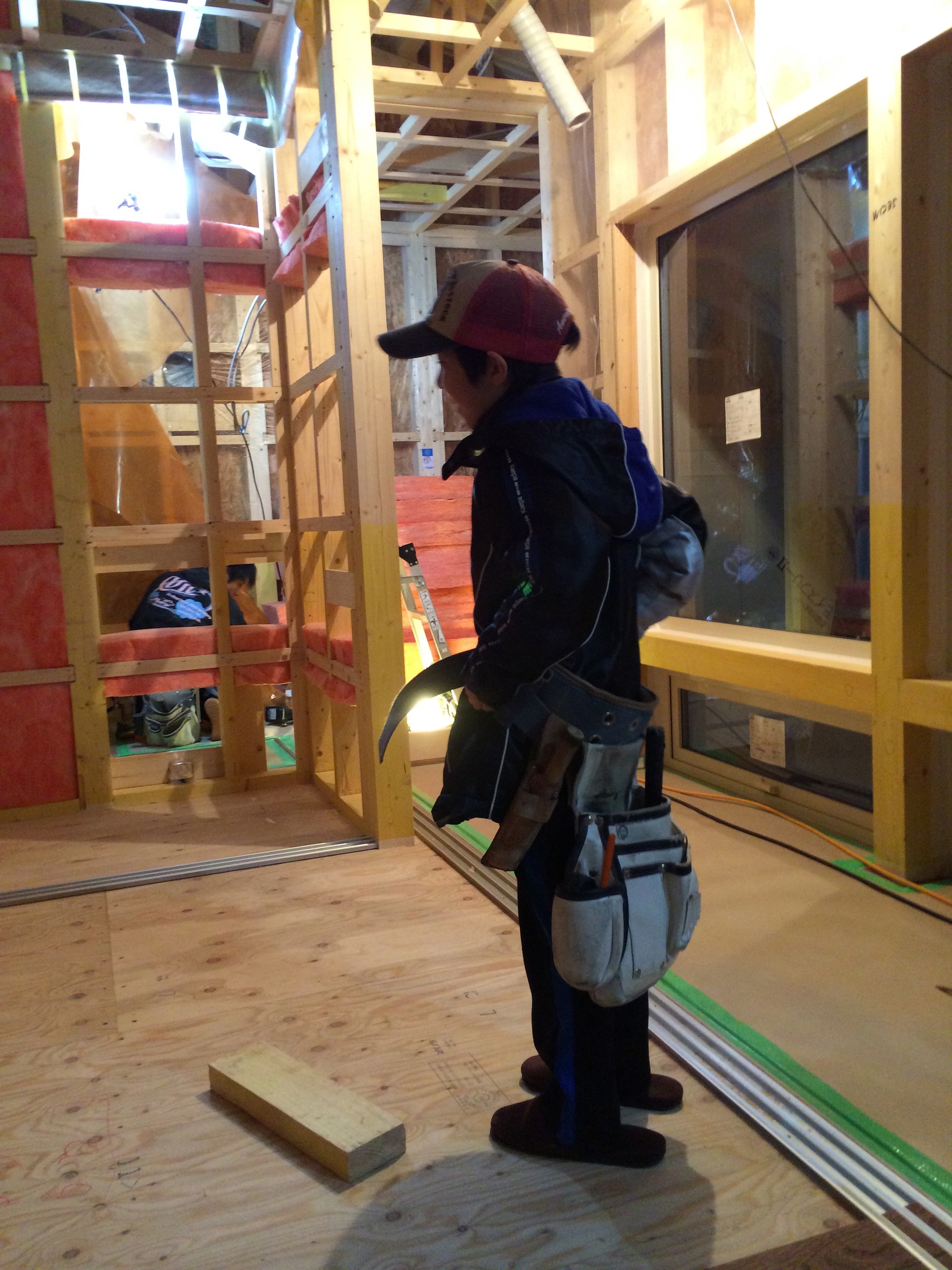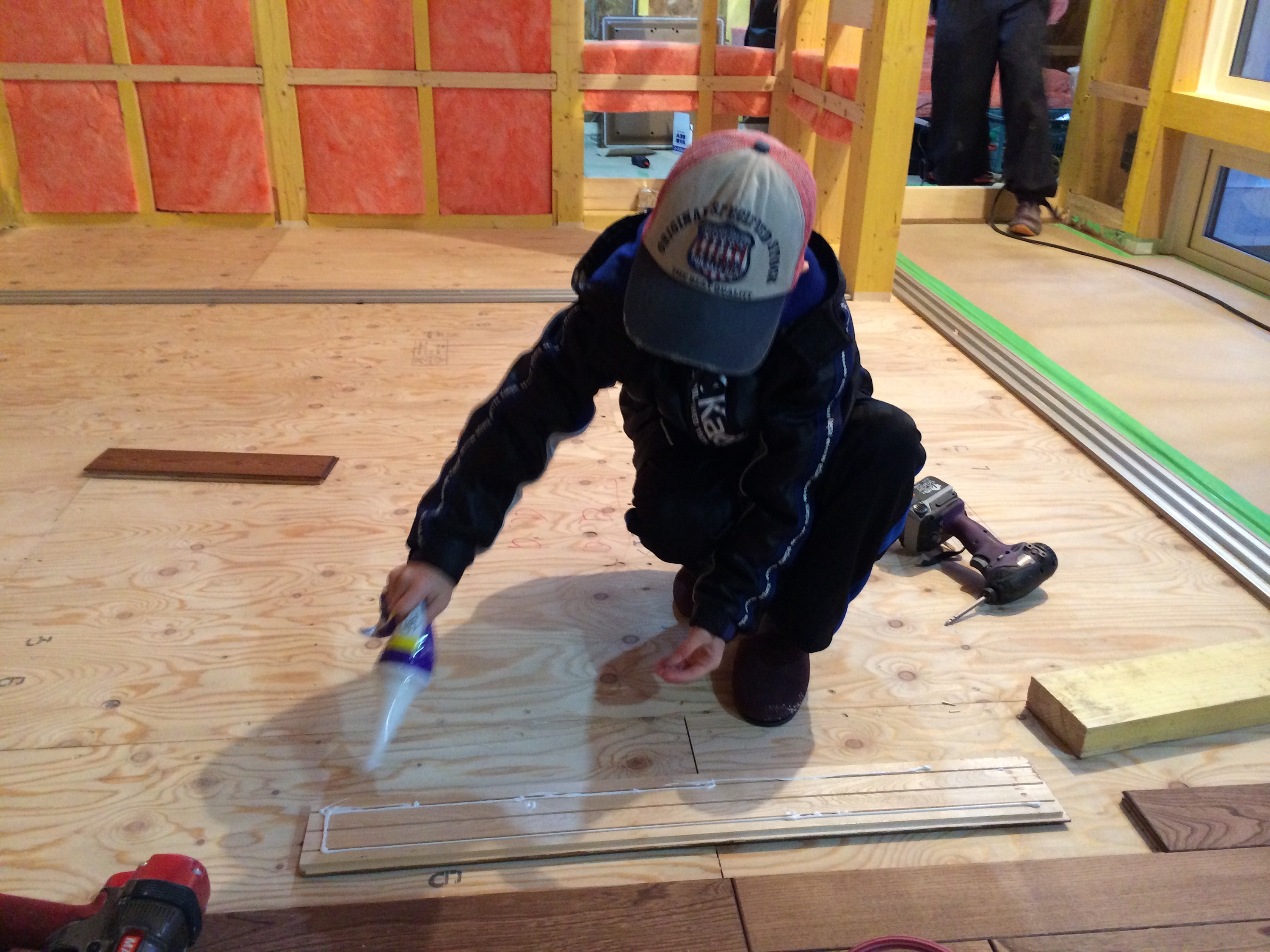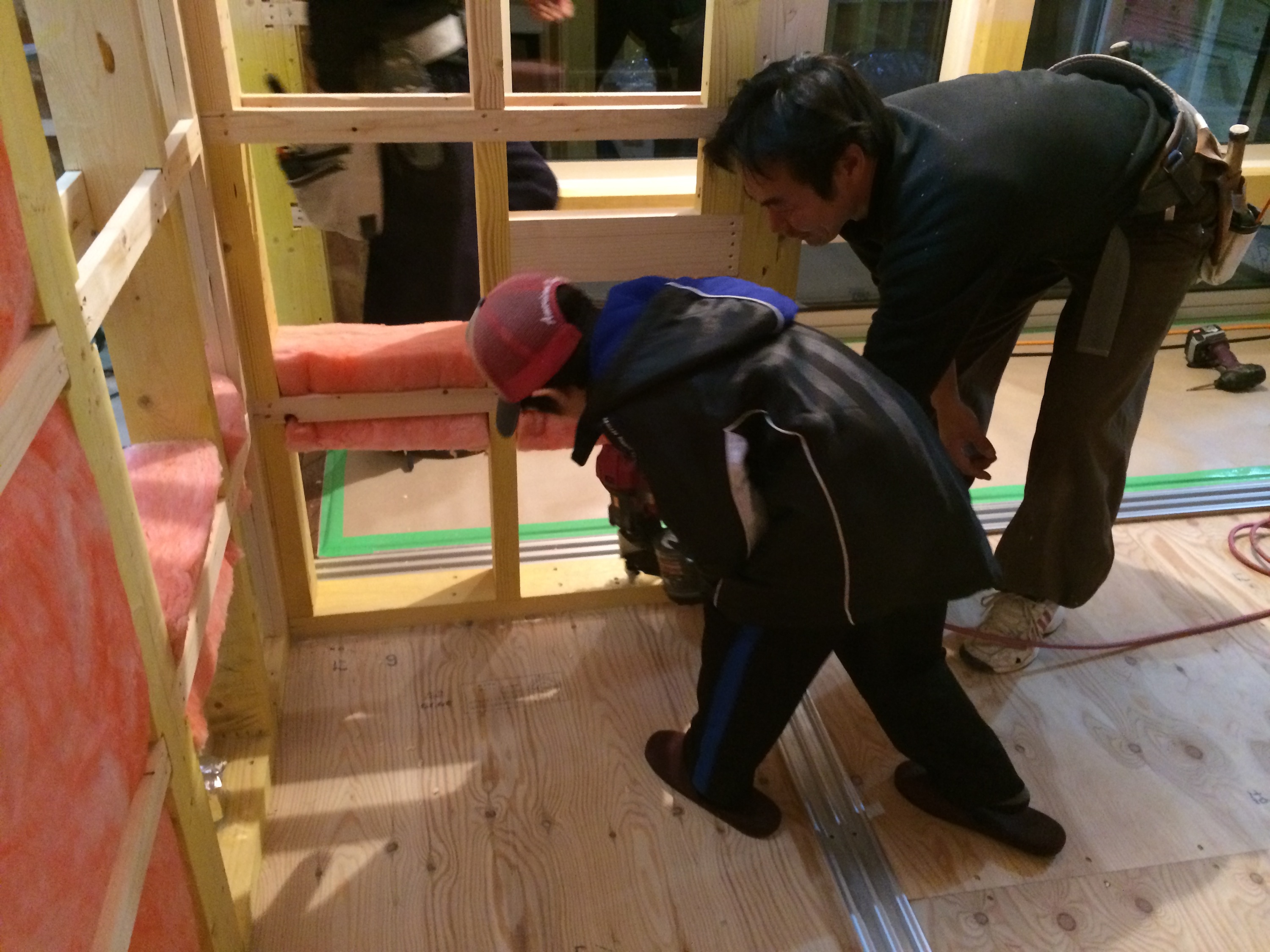 今日はお施主様のお子様達が現場へ来てフロア貼りのお手伝い。
