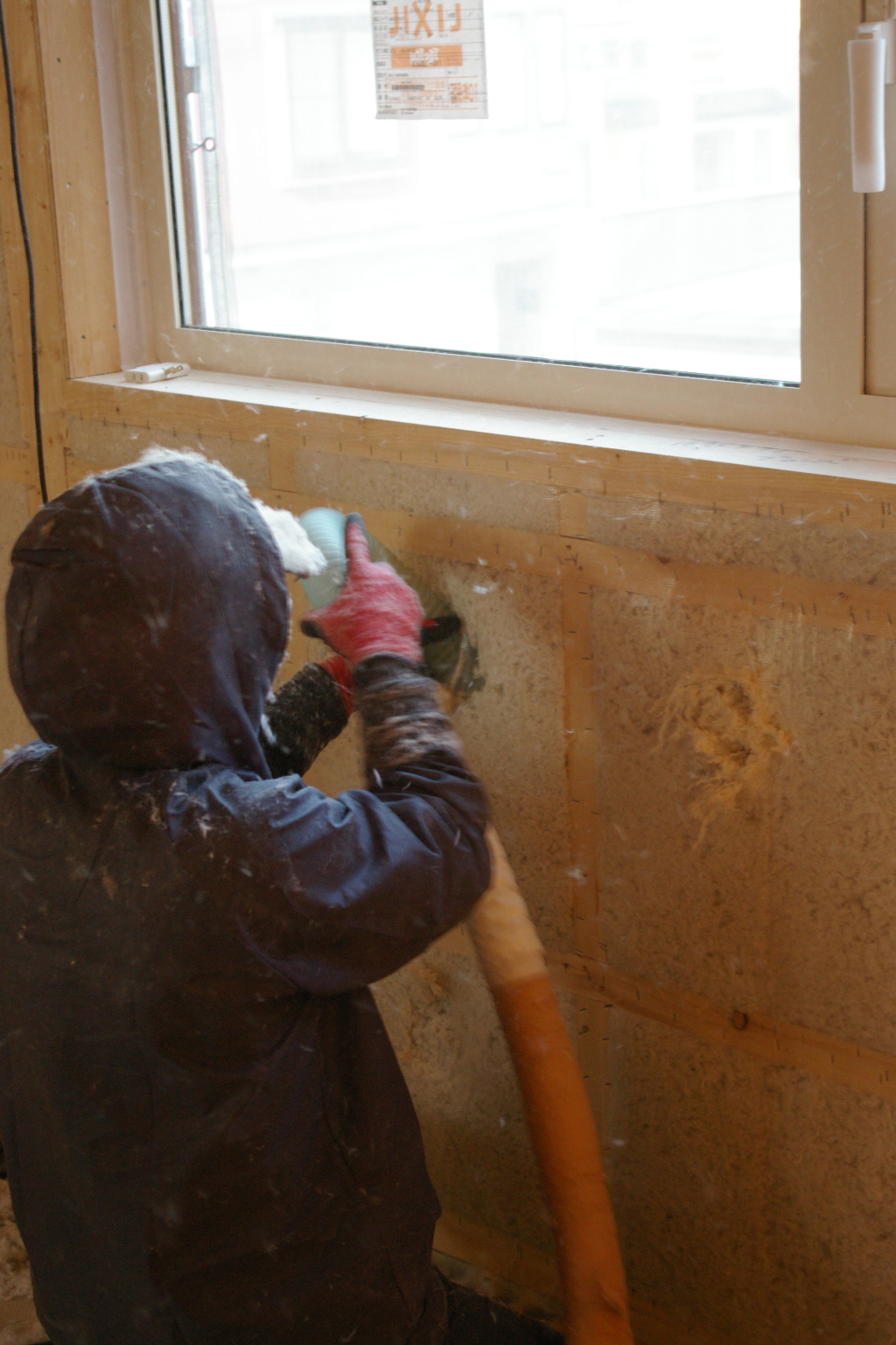 壁にロックウールブローを吹き込みます。