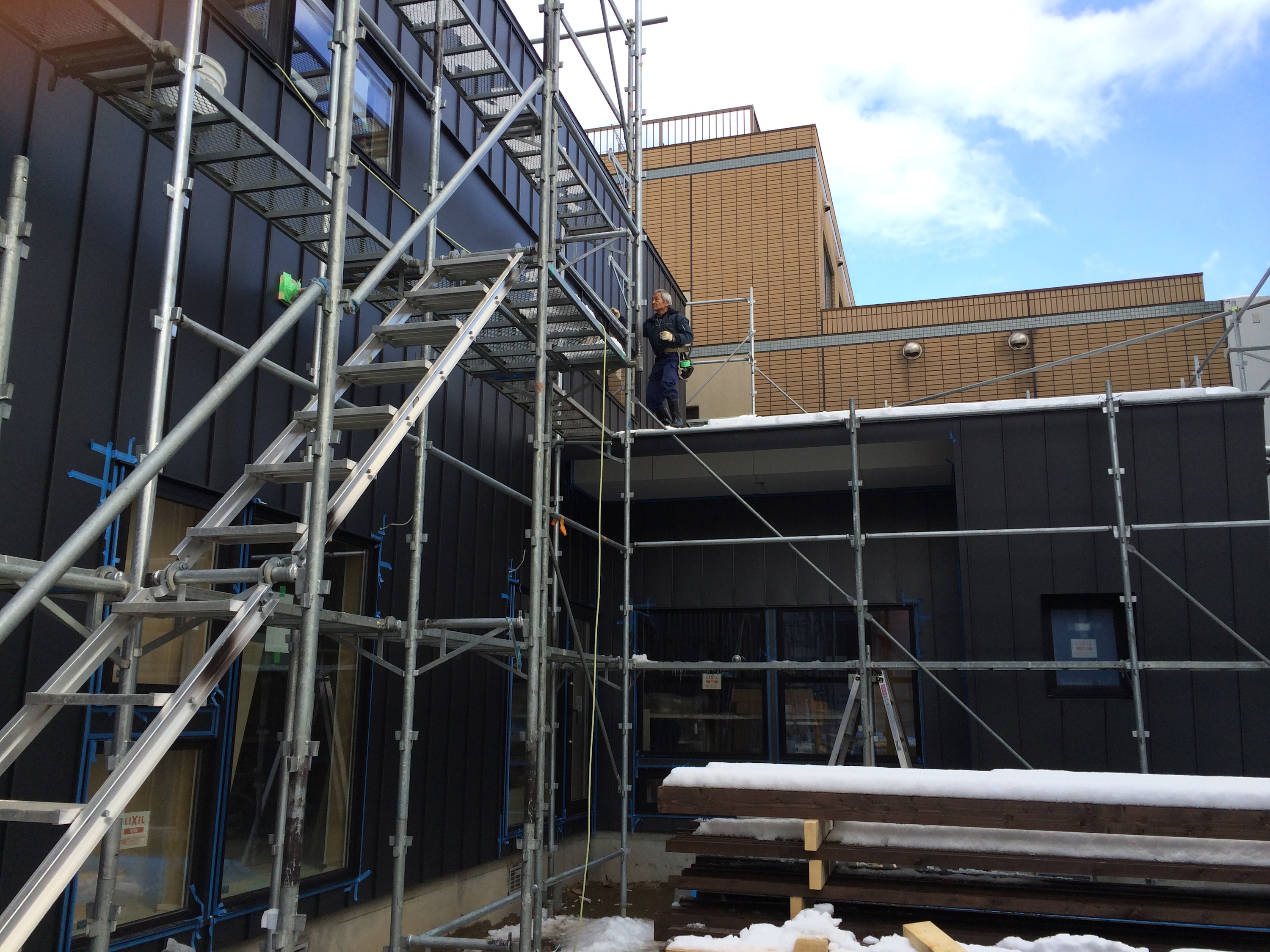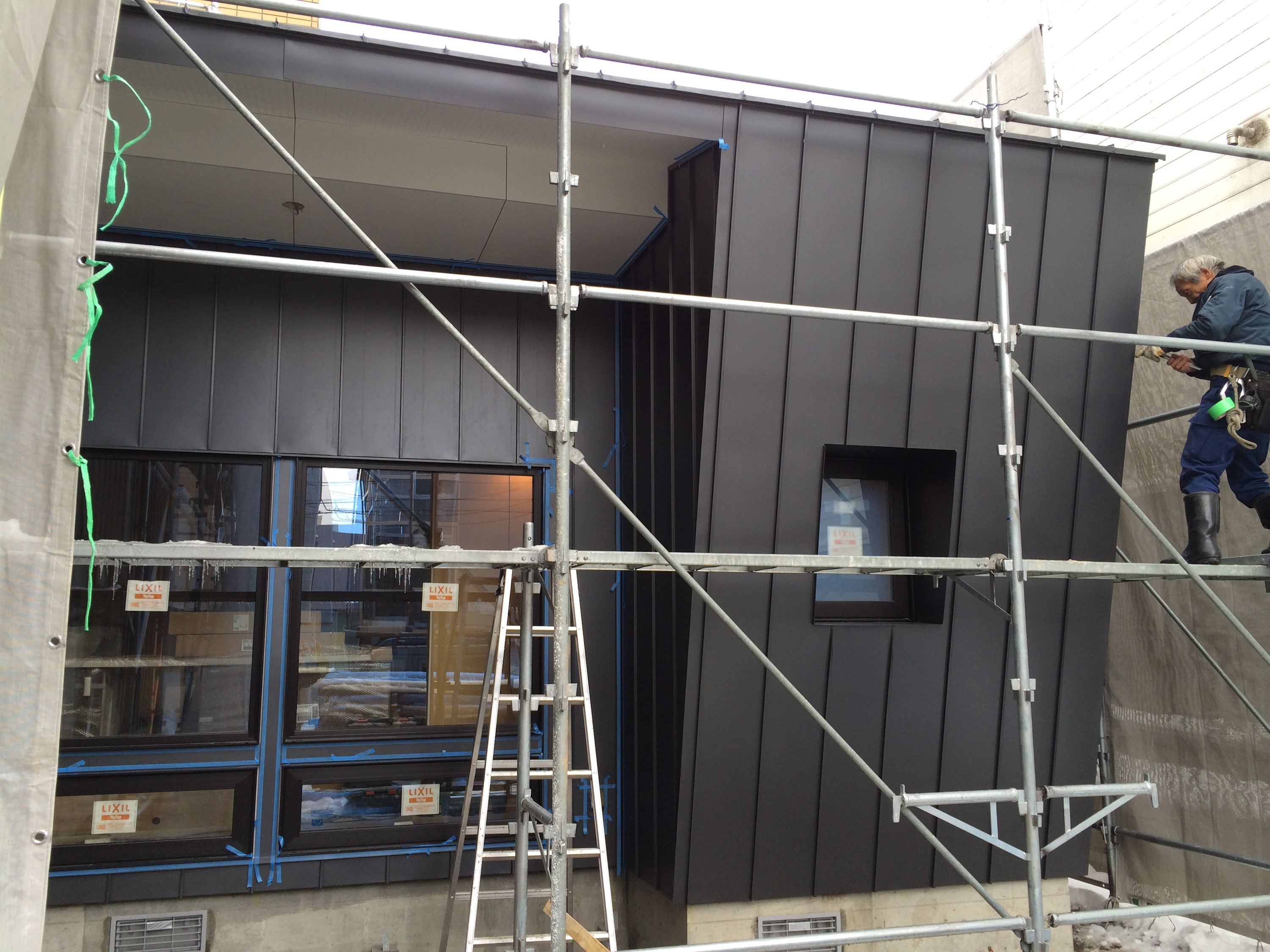 板金工事、コーキングも終わり養生ネットを外して。