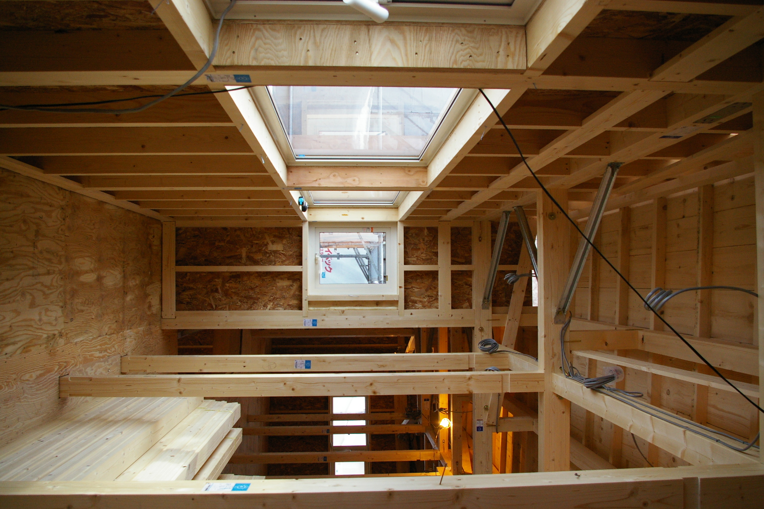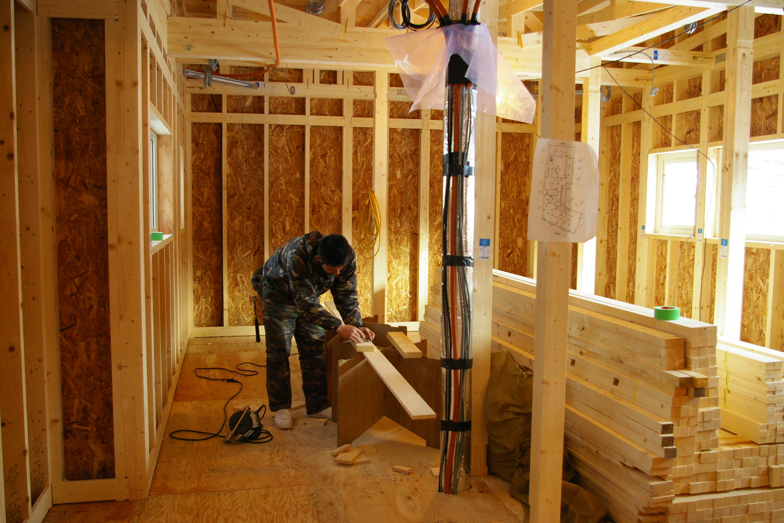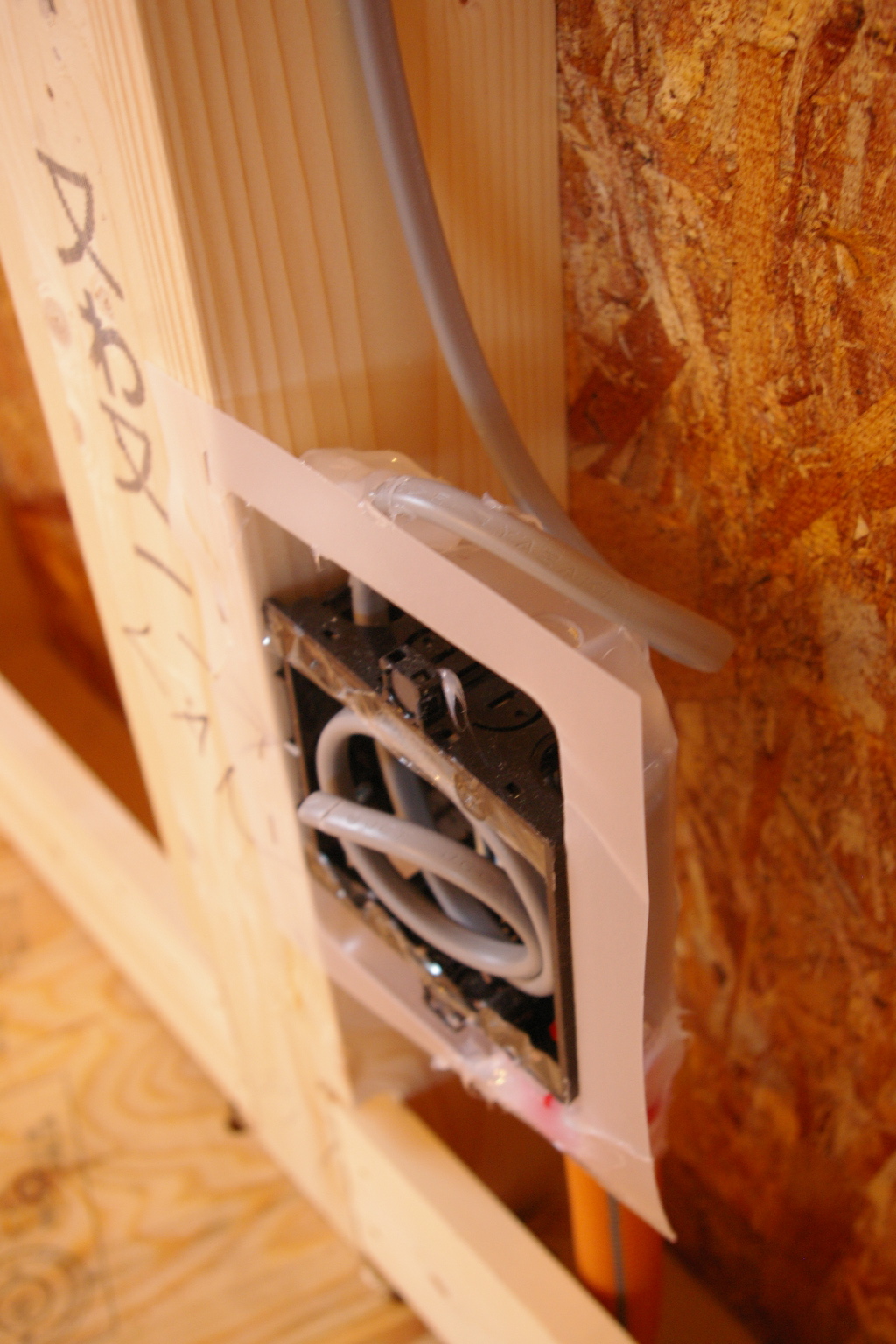 電気工事も施工中。気密カバーとコーキングで気密確保してもらいます。