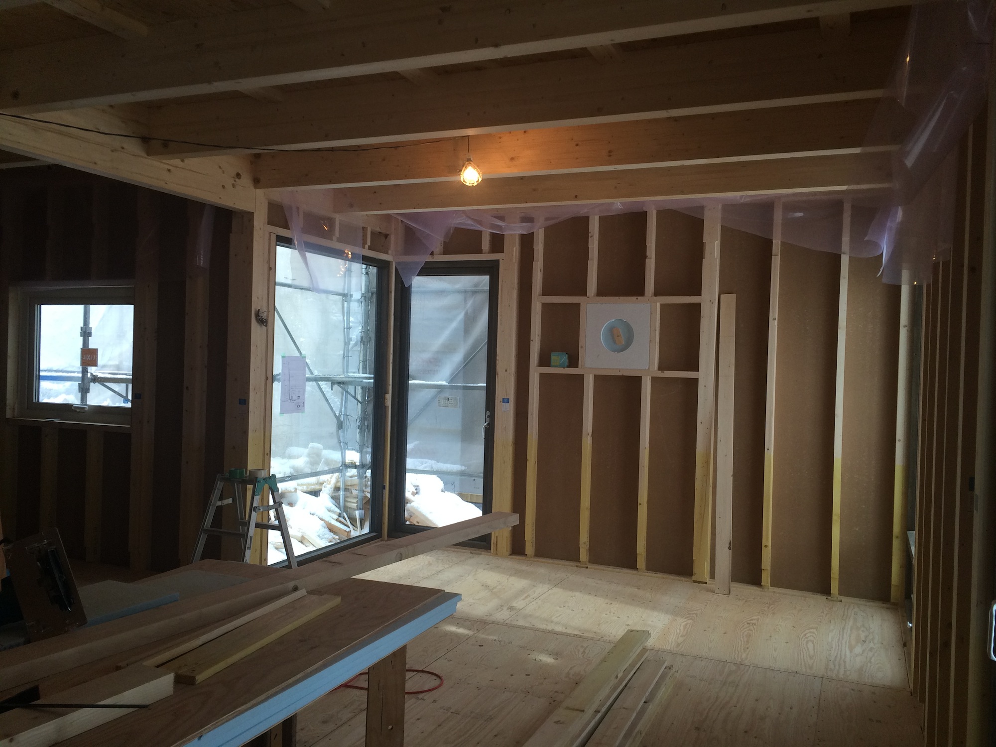 1階は床下地まで終わり、壁には撒きストーブ用メガネ石が施工されました。